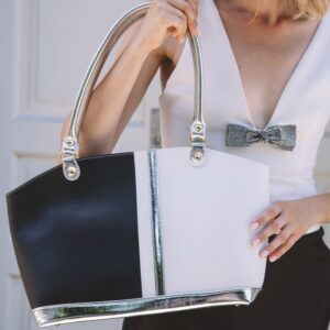 Модели в стиле color block привлекают внимание эффектными комбинациями цветов, которые придают образу динамичность. В 2024 году особенно актуальны контрастные сочетания. Например, обратите внимание на модель из летней коллекции бренда Lafayette Italy – благодаря стильному сочетанию черного и белого и серебристой отделки, она выглядит строго элегантно и в то же время торжественно.