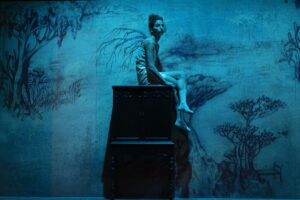 «Гостиная» – просторная комната со сцену размером, косые стены, обклеенные старомодными выцветшими обоями с рисунками, созданными самой Инбаль Пинто – так же как и костюмы и декорации. В углу комнаты валяется старомодный же разношенный ботинок, в центре стоит старомодный же, давний эпохи секретер темного дерева.