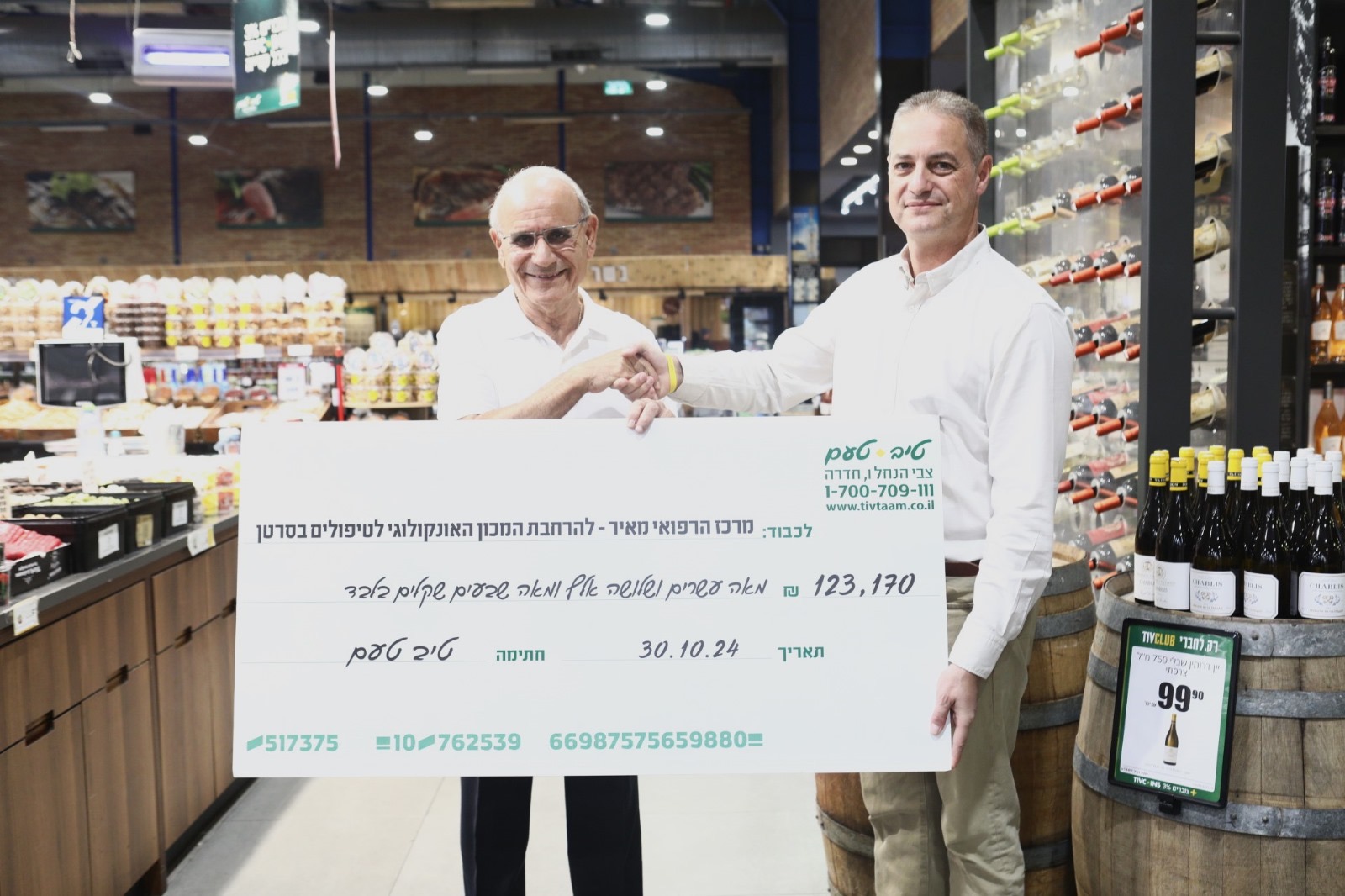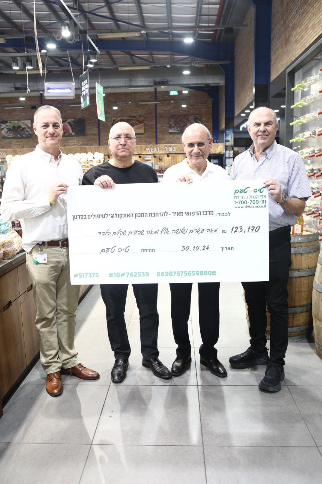 Хагай Шалом и руководство сети магазинов “Тив Таам” организовали торжественную церемонию для представителей медицинского центра “Меир” и ассоциации “Друзья медицинского центра Меир” во главе с директором больницы доктором Яаковом Хеном и генеральным директором ассоциации Ариэлем Фишбейном. В рамках этого мероприятия “Тив Таам” передала пожертвование в размере 123,170 шекелей, направленное на поддержку реконструкции и расширения онкологического центра для передового лечения рака.