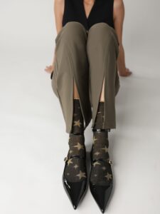 Этот сезон привлекает внимание к текстурам: плотные сетки, матовые покрытия и едва уловимые переливы. Они моментально превращают простые образы в ультрамодные. Плотные текстуры добавляют тепла и уюта, а полупрозрачные варианты делают образ лёгким и загадочным. Дизайнерские колготки и носки создают потрясающий контраст с зимними нарядами, идеально дополняя как casual, так и офисные образы.