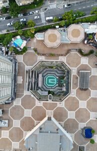Комплекс включает один торговый этаж над уличным уровнем и ещё один подземный этаж. В центре – восьмиугольный внутренний двор-патио с фонтаном и открытой площадкой, создающий атмосферу спокойствия и уюта. Крыша доступна для свободного посещения. Недавно отреставрированная парковка на 1000 мест с зарядными станциями для электромобилей предлагает комфортное и современное парковочное пространство.