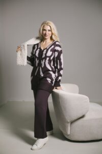 «Образ для встречи Нового года в домашней атмосфере перед камином или в загородном доме. Трикотажный костюм из кардигана и брюк с абстрактным принтом в сочетании с пушистым шарфиком будто обволакивает и расслабляет вас и создает уютное новогоднее настроение».