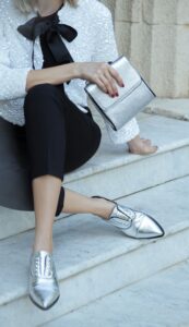 Иногда настроение праздника образу могут придать аксессуары. Серебристые оксфорды от Lafayette Italy – это микс дерзости и элегантности. Они прекрасно впишутся в любой образ: от брючного костюма до нарядного платья с пайетками. В них легко сочетать классику с немного рок-н-рольным настроением. А маленькая серебристая сумочка завершит ансамбль. Компактная, изящная и невероятно фотогеничная, в сочетании с оксфордами, она придаст образу нарядной, но не перегруженный вид.