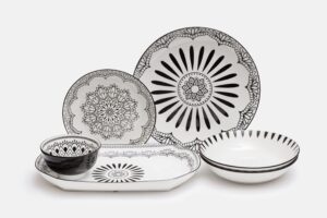 Коллекция включает как сдержанные классические дизайны, так и более яркие, с этническими мотивами. Формы – удобные, без сложных деталей, так что посуда подойдет и для праздничного стола, и для повседневного использования.