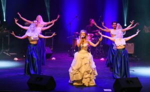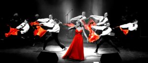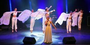 Работу голоса и пространства дополняет хореография театра EMOTIONS — не в роли иллюстрации за спиной солистки, а как самостоятельный пласт шоу. Их пластика говорит, или даже поет, но не словами, а пластикой, как будто движения рождаются не от замысла хореографа, а из внутренней необходимости передать чувства.