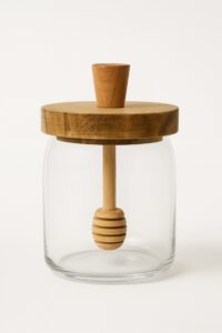 Capri: набор на деревянном подносе с керамическими плитками, включающий 4 подставки под стаканы с лимонным принтом, стеклянную баночку для хранения и подачи мёда с деревянной крышкой, керамическую подставку под горячее с лимонным рисунком и 2 маленькие керамические пиалы в форме рыбок.
