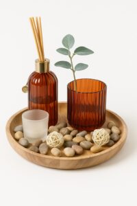 Amber: набор в тёплой цветовой гамме — освежитель воздуха с амбровым ароматом фруктов и древесных нот, подсвечник из стекла глубокого оттенка, ещё один подсвечник из белого молочного стекла, всё это расположено на декоративном круглом деревянном поднсе с галькой и двумя декоративными шариками.