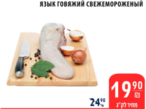 Язык говяжий свежемороженый – 19,90 за 100 гр (вместо 24,90)