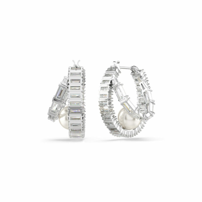 В центре внимания – серьги-кольца с покрытием из блестящего родия. Изящные, усыпанные камнями Swarovski в огранке багет и украшенные одиночной жемчужиной у основания, они создают ощущение лёгкости и утончённого блеска. Такой аксессуар подчёркивает женственность, уверенность и вкус – будь то деловой день или вечер в приглушённом свете.