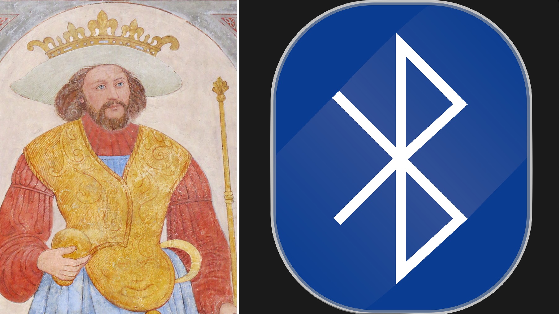 Bluetooth дословно переводится с английского языка как «синий зуб». Это адаптация датского слова Blåtand — «синезубый». Так прозвали короля викингов Харальда I. Он жил на территории современной Дании около 1 000 лет назад и прославился тем, что объединил враждующие датские племена в одно целое. Bluetooth делает то же самое с протоколами связи — объединяет их в один универсальный стандарт.