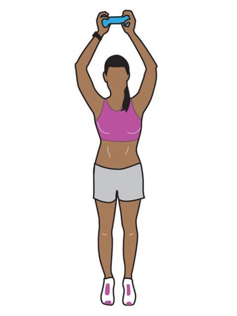И.П. – стоя, ноги на ширине плеч, двумя руками держим тяжелый мяч / гантель. Напрягаем мышцы пресса, далее поднимаем руки вверх над головой, энергично поднимаясь максимально высоко на 10 счетов. Опускаем руки. Выполняем 5 раз.