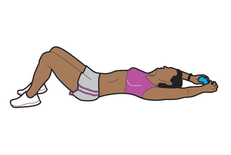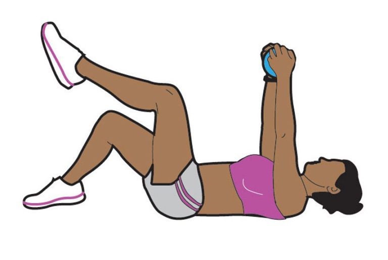 И.П. – лежа на спине, колени согнуты, двумя руками держим гирю на груди. Напрягаем мышцы пресса, подтягиваем подбородок к грудине и отрываем плечи от коврика. Толкаем вес над головой и назад, чтоб локти оказались рядом с ушами; возвращаем вес на грудь, опускаемся вниз. Выполняем 2 подхода по 10 повторов.