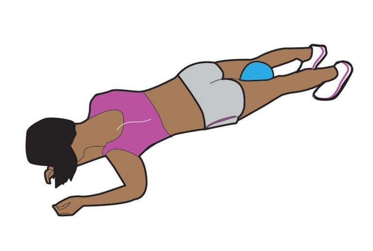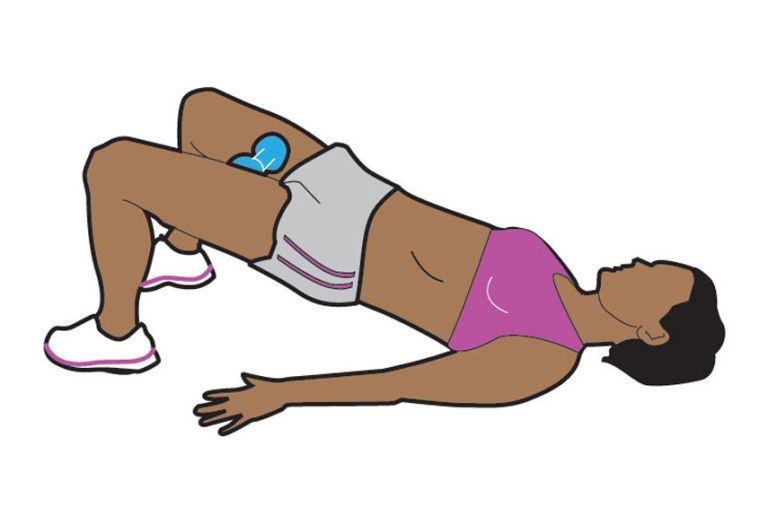 И.П. – лежа на спине, колени согнуты, стопы полностью стоят на полу. Помещаем мяч (другой груз) между внутренней поверхностью бедер. Втягиваем пресс, теперь прижимаем пятки к коврику, стараясь поднять таз от пола, сжимая внутреннюю сторону бедер вместе. Удерживаем положение на 10 счетов. Опускаем бедра. Выполняем 5 раз.