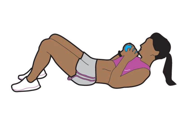 И.П. – лежа на спине, колени согнуты, двумя руками держим гирю. Поднимаем руки и заводим за голову, чтобы вес коснулся пола. Напрягаем мышцы пресса и удерживаем вес на 1 счет; теперь на выдохе подтягиваем подбородок к грудине и отрываем плечи от пола, приподняв руки на 15-20 см от пола, локти прижимаем к ушам. Удерживаем на 2 счета, отпускаем вес. Выполняем 2 подхода по 10 повторов.