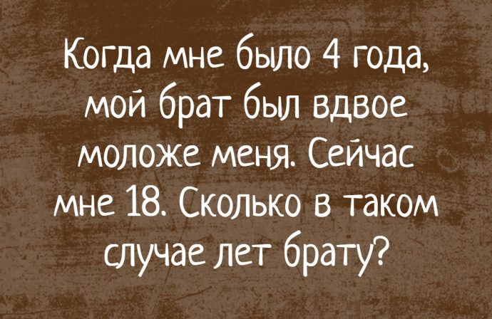 Когда мне было 4 года, мой брат был вдвое моложе меня. Сейчас мне 18. Сколько в таком случае лет брату?