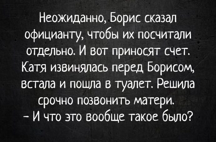 — Да, я рассчитывала на это! — говорит Катя. — Я не имела желания идти в такой дорогой ресторан, но Борис настаивал. Я не сильно ориентируюсь в ценах, потому что вообще никогда не посещаю такие заведения. Если бы я знала, какой счет мне принесут в конце — то встала бы и ушла. Но Борис сказал, что здесь адекватные цены. Он прекрасно понимал, что у меня небольшая зарплата, я простой воспитатель в детском саду.