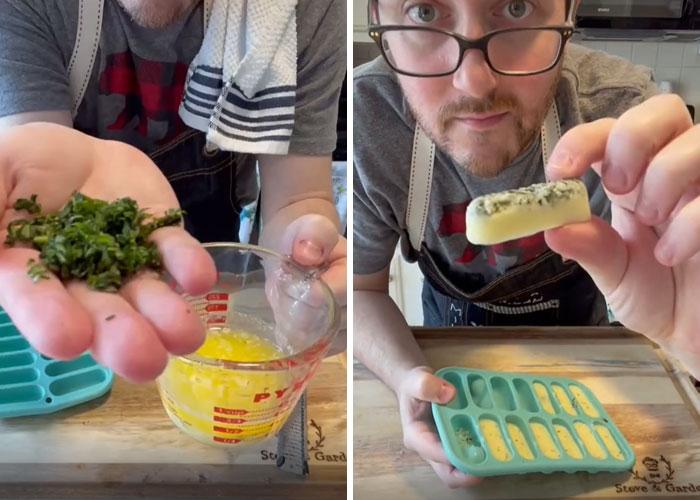 Подсыхающую зелень нарезаем, заливаем топленым масло со специями и замораживаем. Получаем усилители вкуса для супов и каш.