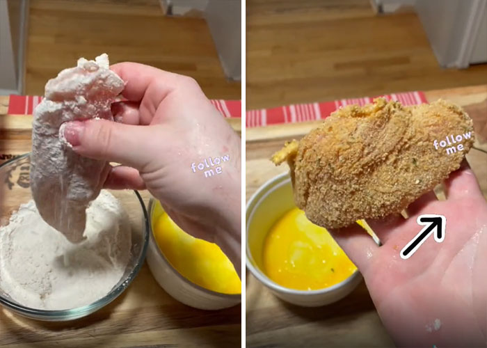 Сначала обваляйте мясо в муке, а только потом в яйце и панировке — лучше держаться будет