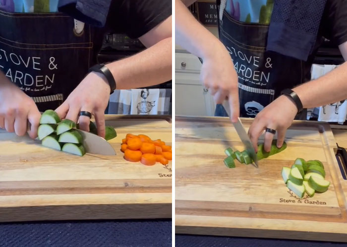 Чтобы кусочки овощей не прилипали к ножу, наклоняйте его и режьте кончиком, а не всем лезвием