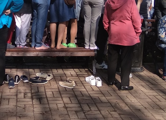 2. Люди смотрят парад со скамейки