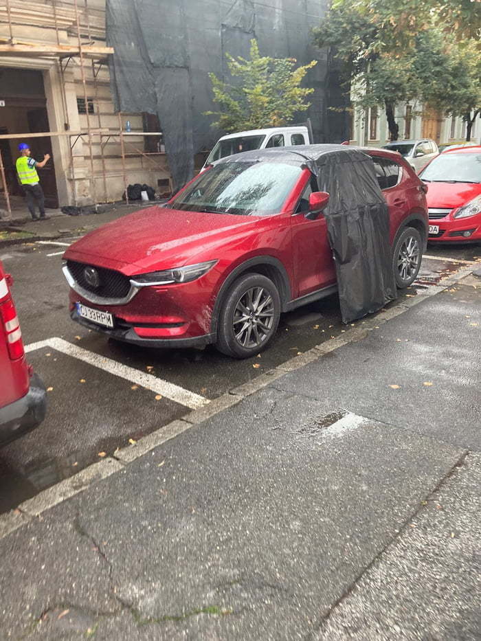 3. Случайно оставил свою машину с открытым люком, и пошёл дождь. Рабочие накрыли его плёнкой