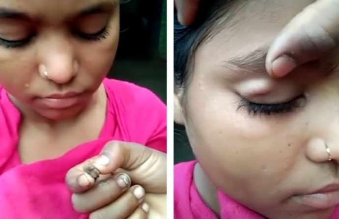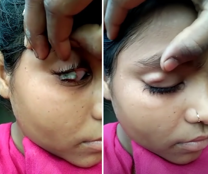 На видео, которое попало в интернет видно, как у девочки на веке имеется небольшая шишка. После того как веко отворачивают из него извлекают небольшой камень.