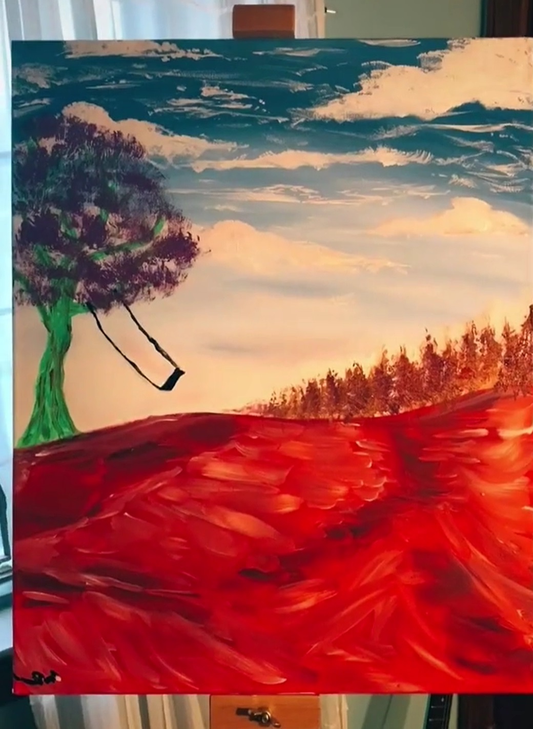 На картине появилась трава огненно-красная трава, сиреневатые листья на деревьях, а вот с небесной гладью девушка угадала – он получилось похожим на океан.