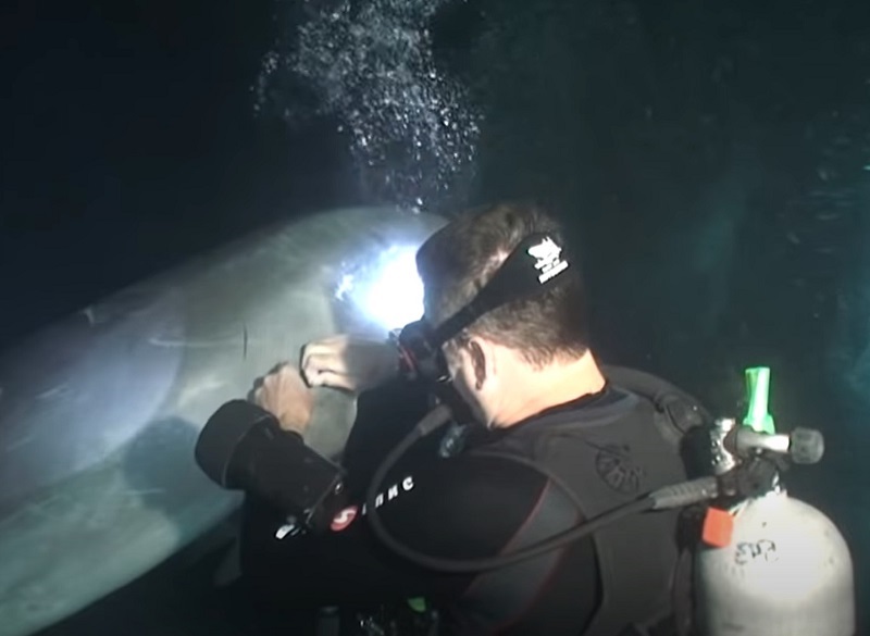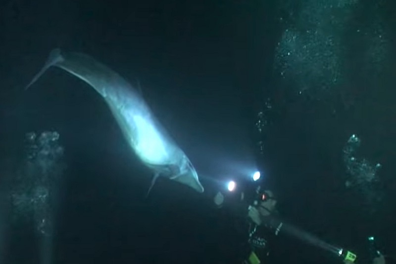 Дайверы-любители в компании с инструктором выполняли погружение в темное время суток. Но тут из темноты к ним выплыл дельфин.