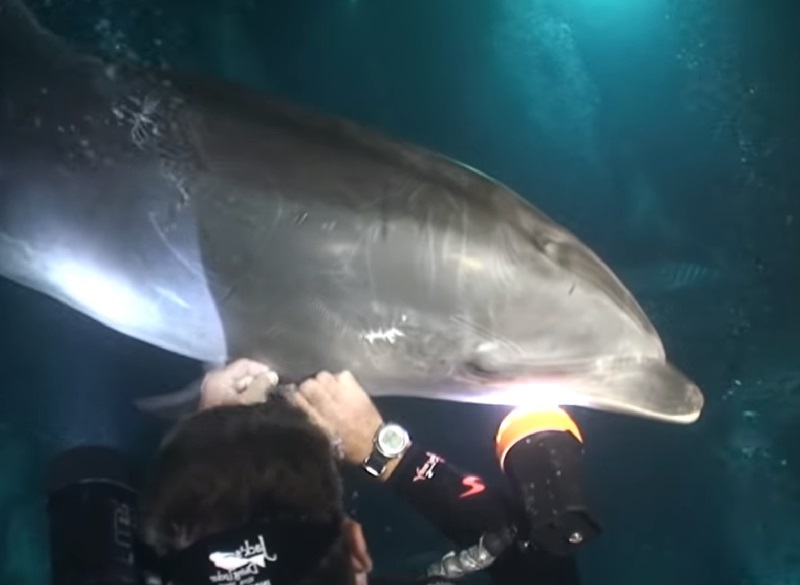 Инструктор на протяжении восьми минут боролся с леской, разрезая и распутывая ее. Это время дельфин вел себя покорно и ожидал окончания мероприятия – только один раз он выплыл на поверхность, чтобы вдохнуть кислород.