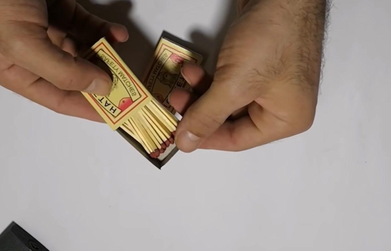 Далее он отломал спичку, с помощью ножа отрезал ее на нужную длину, подточил кончик и установил в скважины.