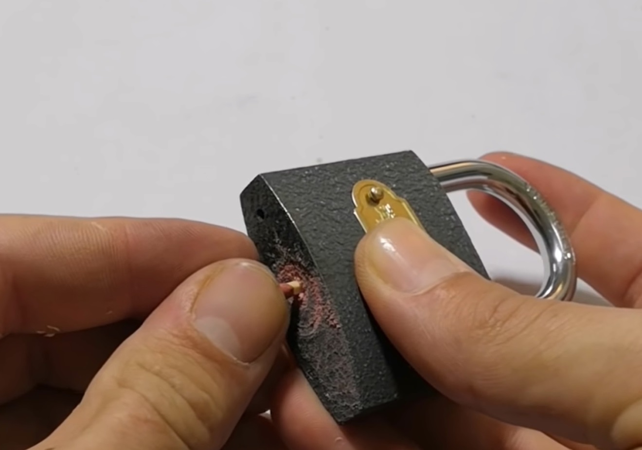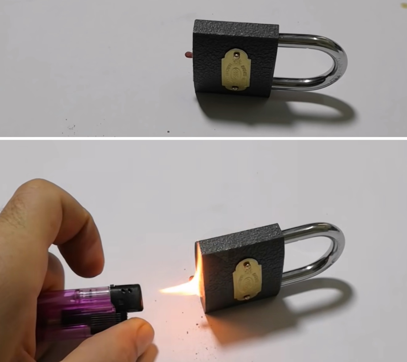 Чтобы показать зрителям технологию открывания без ключа автор ролика использовал классический замок. Он продемонстрировал пользователям его исправность, а после закрыл и положил на стол.