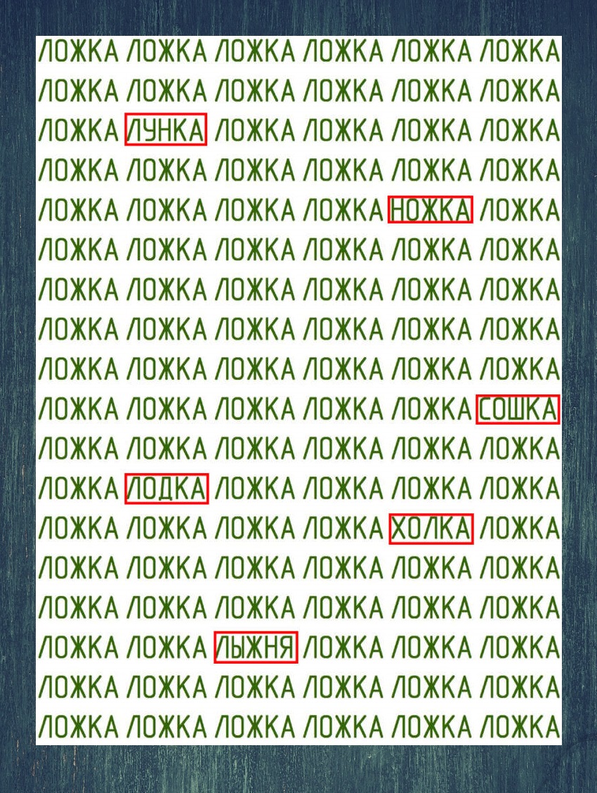 Не смогли найти все 6 слов? Не беда, сейчас мы вам покажем, где же они спрятались! А вы, в свою очередь, обратите внимание, что вам нужно лучше тренировать свою внимательность.