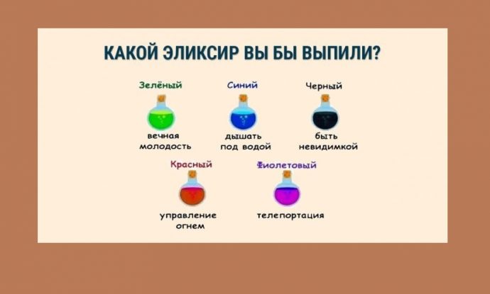 2. Синий эликсир «Подводное дыхание» — выпив этот эликсир, вы стали русалкой. Таким образом, вы желаете сбежать от действительности! Вам трудно строить отношения с людьми и поэтому вы чувствуете себя одиноким человеком. На самом деле достаточно лишь избавиться от общения с теми людьми, которые вам причиняют психологический вред.