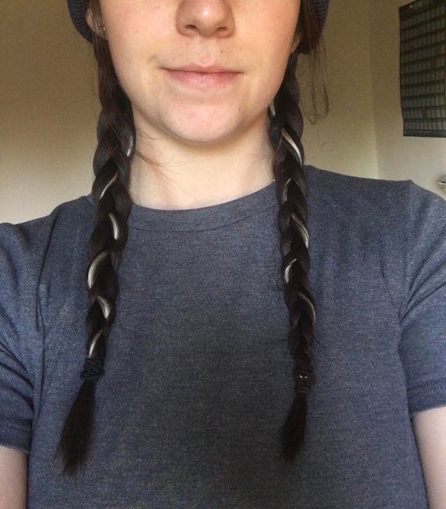 У меня пятно белых волос на затылке прямо посередине, поэтому, когда я заплетаю косы, это выглядит так