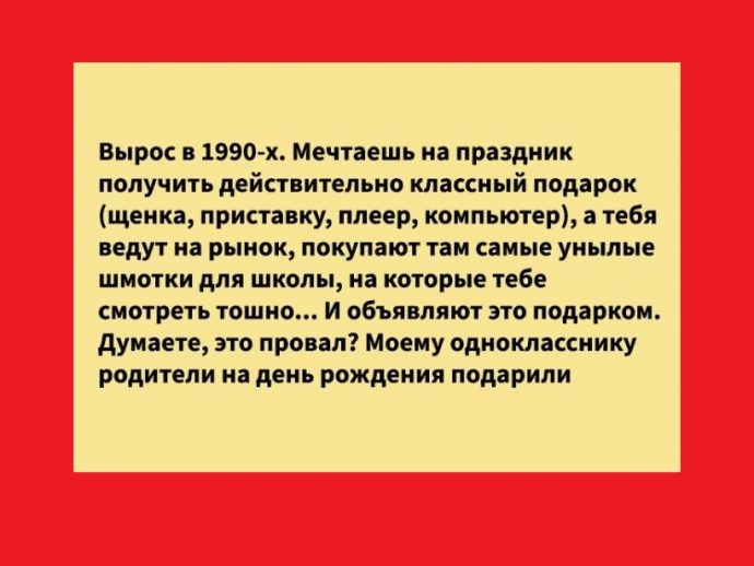 Вырос в 1990-х. Мечтаешь на праздник получить действительно классный подарок (щенка, приставку, плеер, компьютер), а тебя ведут на рынок, покупают там самые унылые шмотки для школы, на которые тебе смотреть тошно… И объявляют это подарком на день рождения, Новый год, 8 Марта, 23 Февраля… Думаете, это провал? Моему однокласснику родители на день рождения подарили забор! Забор! Зеленый такой забор вокруг частного дома…
