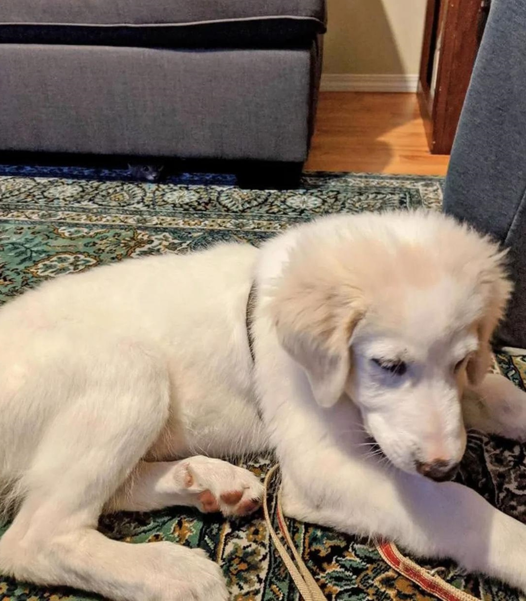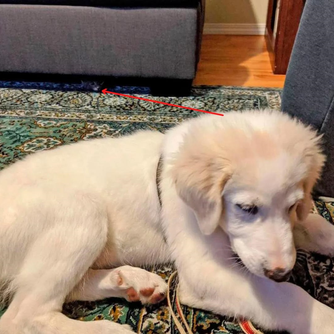 Этот тест на внимательность появился совершенно случайно. Хозяева просто хотели сделать фотографию своего подросшего ретривера, и лишь потом заметили, что кое-где спрятался второй питомец семьи, полосатый серый кот.