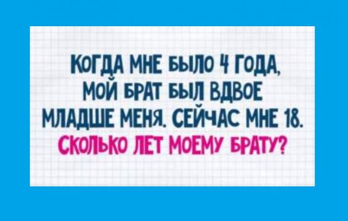 На первый взгляд задача может показаться слишком простой, но необходимо крайне внимательно читать условие. Когда главному герою было 4 года, его брат был вдвое моложе него. Получается: 4 : 2 = 2 года — брат младше на 2 года. Если сейчас парню 18, то его младшему брату: 18 — 2 = 16.