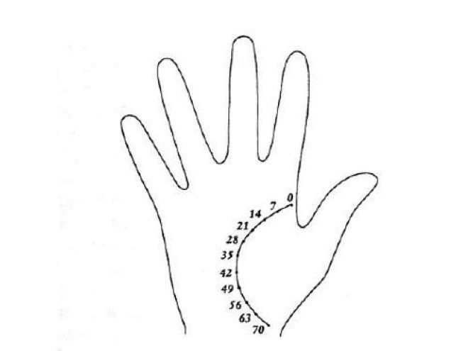 Самый простой способ определить ваш возраст на момент, когда произойдут некоторые события в вашей жизни, — это провести прямую линию вниз от среднего пальца. В точке, где она упрется в линию жизни, будет ваш возраст в 35 лет. Таким образом можно узнать, сколько вы примерно проживете. И если брать эту отметку за основу, то можно определить, в каком возрасте случатся важные события в вашей жизни, о которых будет сказано ниже.
