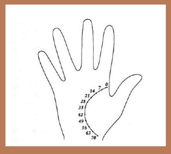 Самый простой способ определить ваш возраст на момент, когда произойдут некоторые события в вашей жизни, — это провести прямую линию вниз от среднего пальца. В точке, где она упрется в линию жизни, будет ваш возраст в 35 лет. Таким образом можно узнать, сколько вы примерно проживете. И если брать эту отметку за основу, то можно определить, в каком возрасте случатся важные события в вашей жизни, о которых будет сказано ниже.