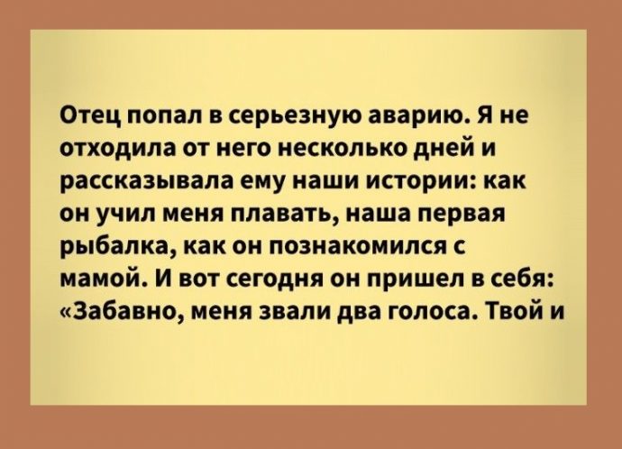 На днях мне позвонили из больницы: «Ваш отец попал в серьезную аварию, его состояние очень тяжелое». Я сорвалась, приехала к нему. Не отходила от него несколько дней, несмотря на все попытки врачей отправить меня домой. Я рассказывала ему наши истории: как он учил меня плавать, наша первая рыбалка, наши походы в кино, как он познакомился с мамой. Сколько я плакала, когда рассказывала все это! И вот сегодня он пришел в себя: «Забавно, меня звали два голоса. Твой и мамин. И я пошел на твой». Мама умерла несколько лет назад. Видимо, хотела увидеть папу снова. Не сегодня, мама, не сегодня.