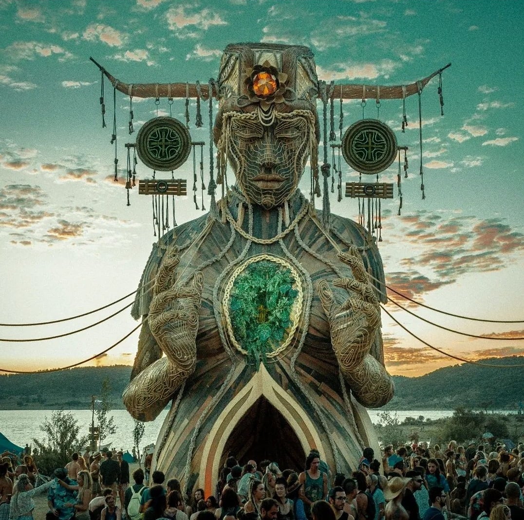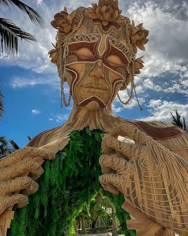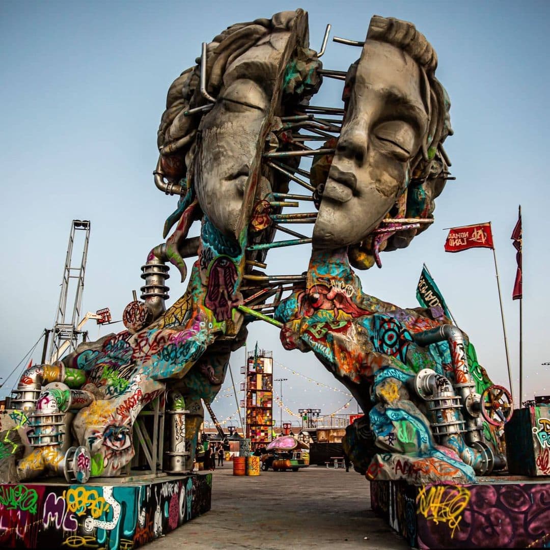 7-метровая статуя фигуры из Лас-Вегаса, которая раздавала воздушные поцелуи посетителям фестиваля Electric Daisy Carnival, когда они входили на площадку.