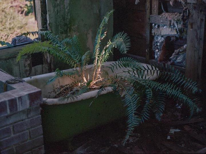 3. Старая ванна в заброшенном доме стала отличным горшком для папоротника. Солнечный свет и вода проникают через дыру в крыше.
