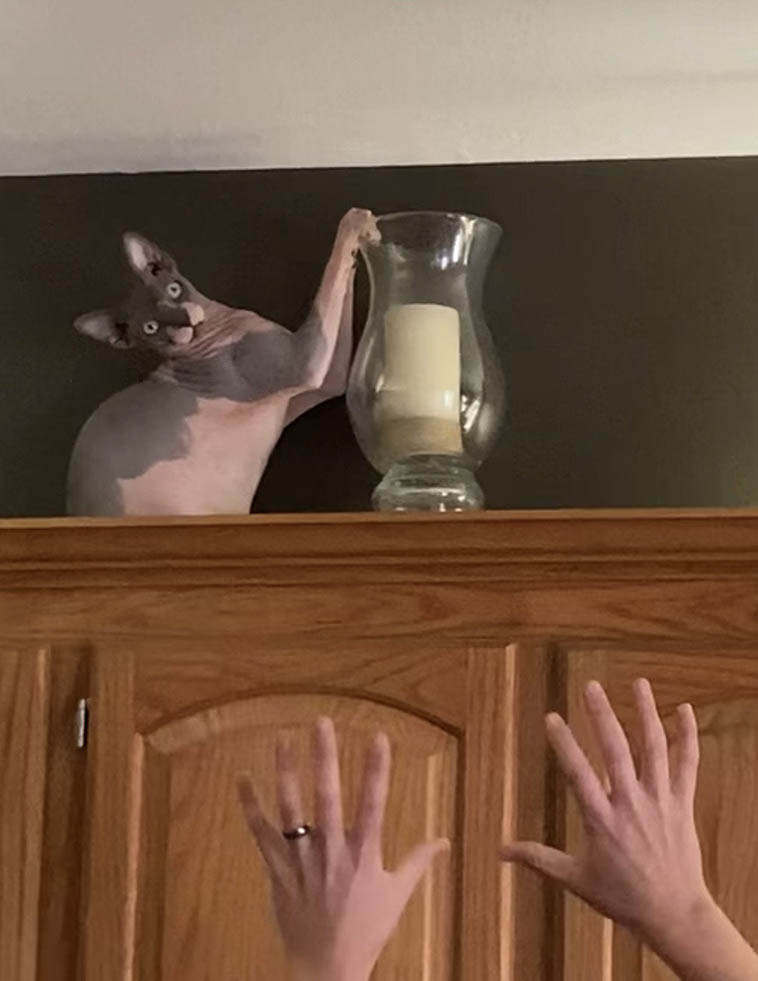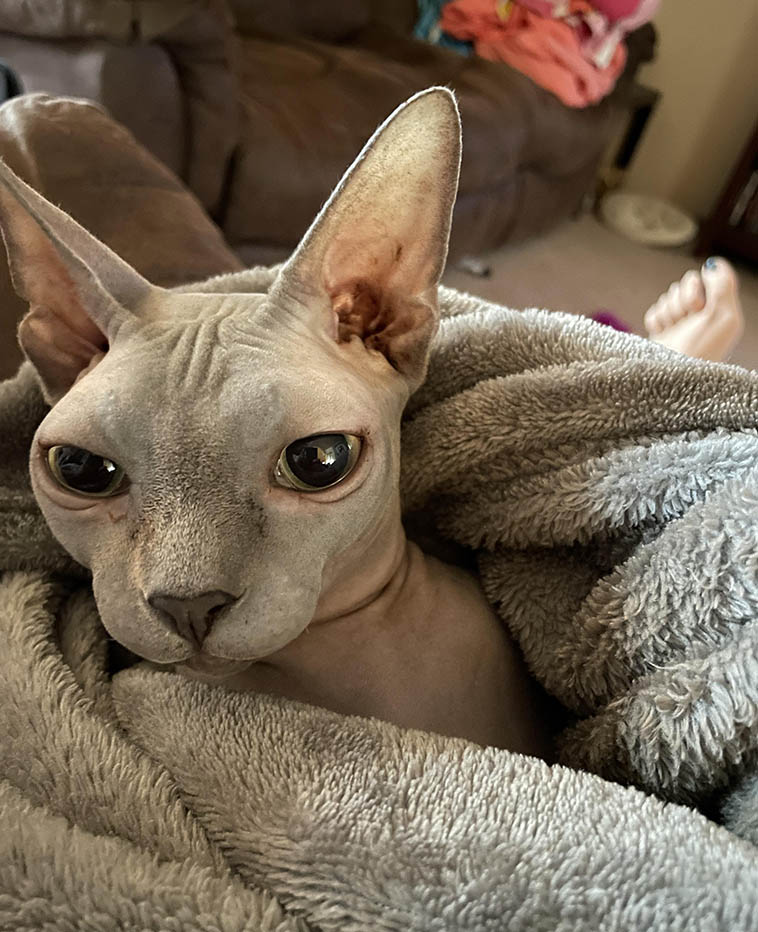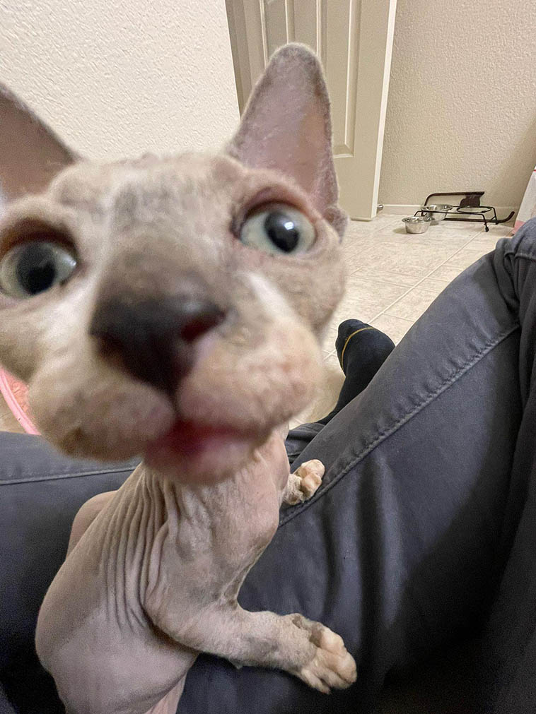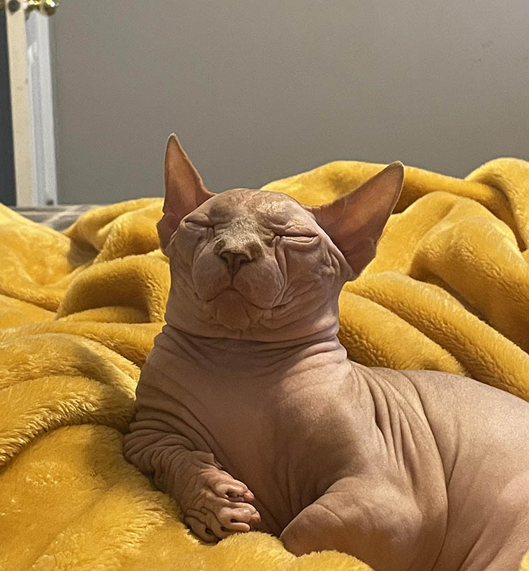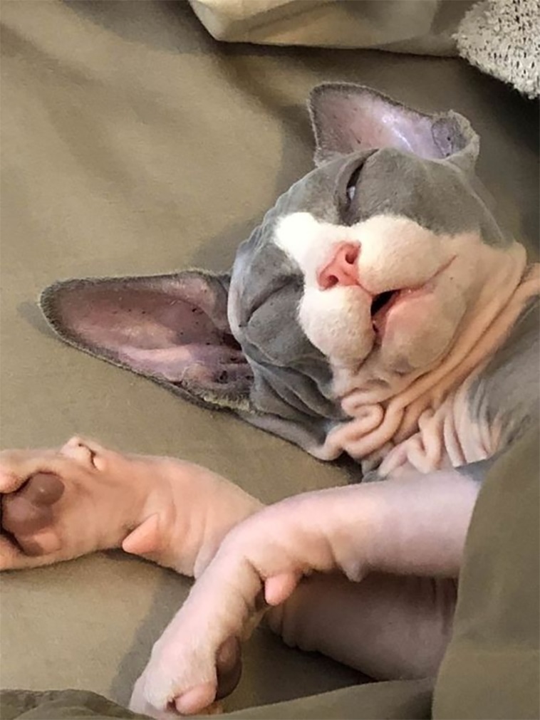 7. Сфотографировать своего кота, когда он спит в смешной позе, — это обязательный пункт у всех кошатников. И владельцы сфинксов — не исключение.