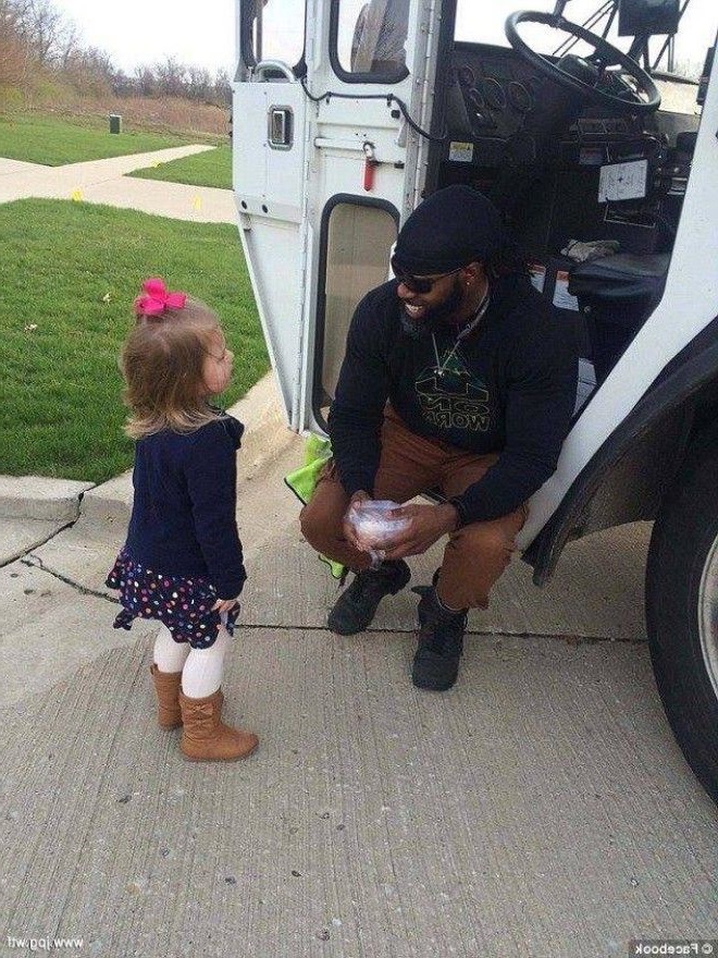 Если вы работаете мусорщиком, то вы, вероятно, считаете, что ваша работа – полный отстой! И очень зря потому, что в любой работе можно найти массу приятных моментов. Например, один мусорщик, живущий в Америке, каждый четверг спешил к одному и тому же дому ради одной единственной вещи – увидеть в окне маленькую девочку по имени Бруклин, которая машет ему рукой, помахать ей в ответ и бибикнуть пару раз в качестве приветствия. Чудесным образом День Рождения малютки выпал именно на четверг, и девочка очень попросила маму о том, чтобы тот приветливый мусорщик заскочил к ним домой хотя бы на минуточку, чтобы Бруклин могла угостить его кексиком. И мама исполнила желание своей дочери. Сам мусорщик был просто растроган и не смог сдержать слез. А маленькая Бруклин стала самой счастливой девочкой на свете – ведь она наконец познакомилась с тем самым дружелюбным мусорщиком.