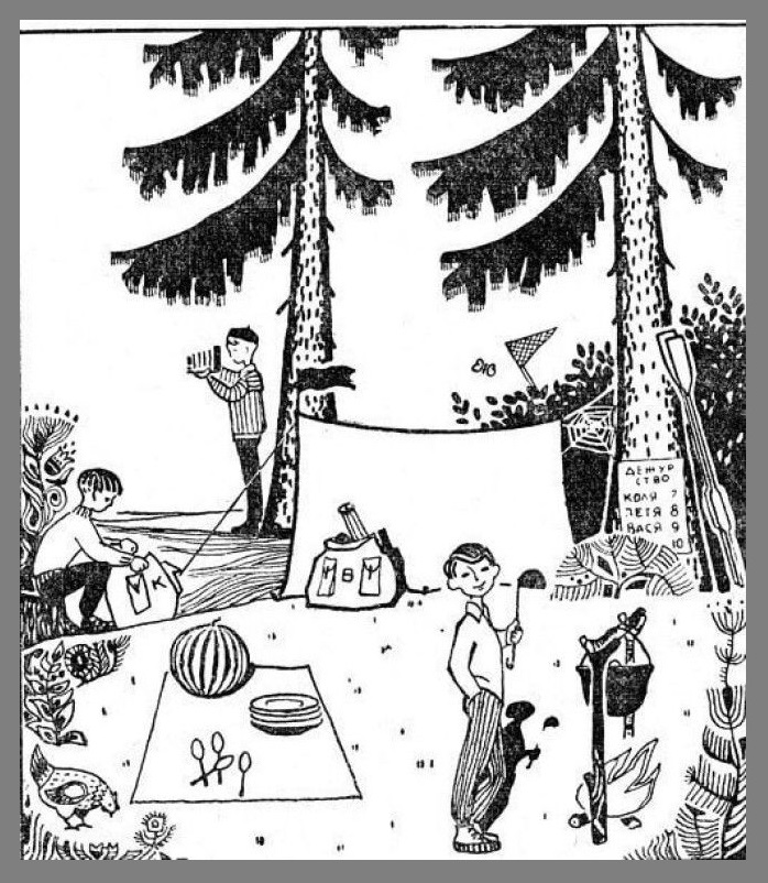- Коля. Сегодня Коля что-то ищет в рюкзаке с буквой «К», Шура ловит бабочек, а Вася фотографирует природу (потому что из рюкзака с буквой «В» виден штатив от камеры). Значит, сегодня дежурит Петя, а вчера, согласно списку, дежурил Коля.
