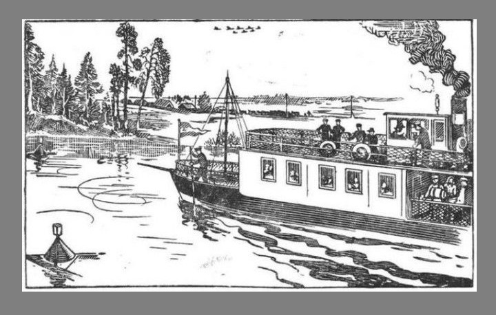 - Очевидно, пароход причаливает к пристани: группа пассажиров, взяв вещи, приготовилась сойти с парохода.