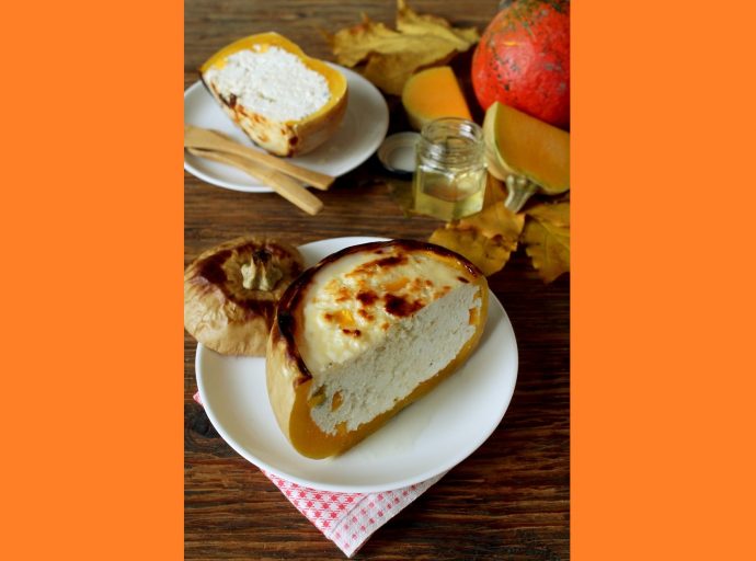 - Пока тыква запекается, можно приготовить творожный слой. Для этого в миске надо смешать творог, яйца, сахар и крахмал. Пробить погружным блендером до полной однородности либо протереть творог через сито.