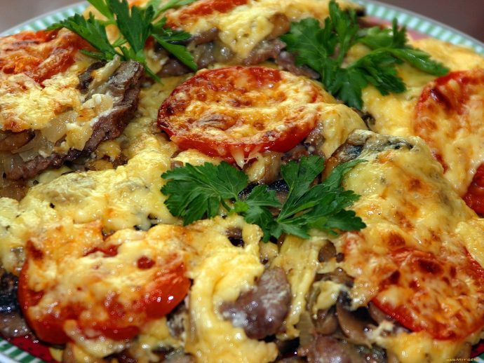 - Аккуратно выложить овощи на мясо. Немного посолить. Смазать сметаной, посыпать сверху сыром.