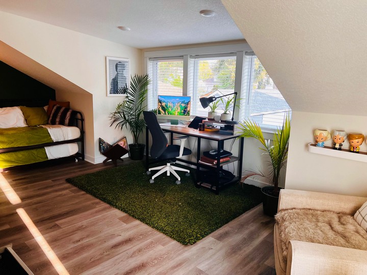 8. “Я предпочитаю минимализм, поэтому для обустройства рабочего места мне хватает стола и компьютерного кресла. Необычным это место делает геометрия комнаты.”
