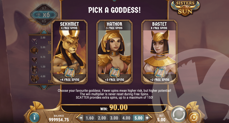 Функция “Сила Богини” может активироваться в любой момент игры. Здесь каждая богиня отвечает за определенные действия, например, например, Сехмет может превратить одни иконки в другие. При этом, Хатор прибавляет 1-2 вайлда на барабаны, а Бастет – удаляет два типа символов с поля.